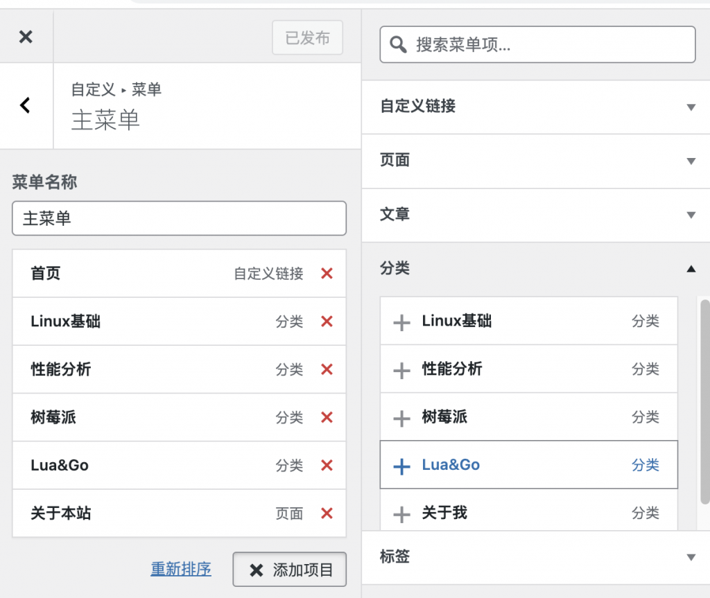2. 在“自定义” – 菜单 – 主菜单 – 添加项目 – 分类